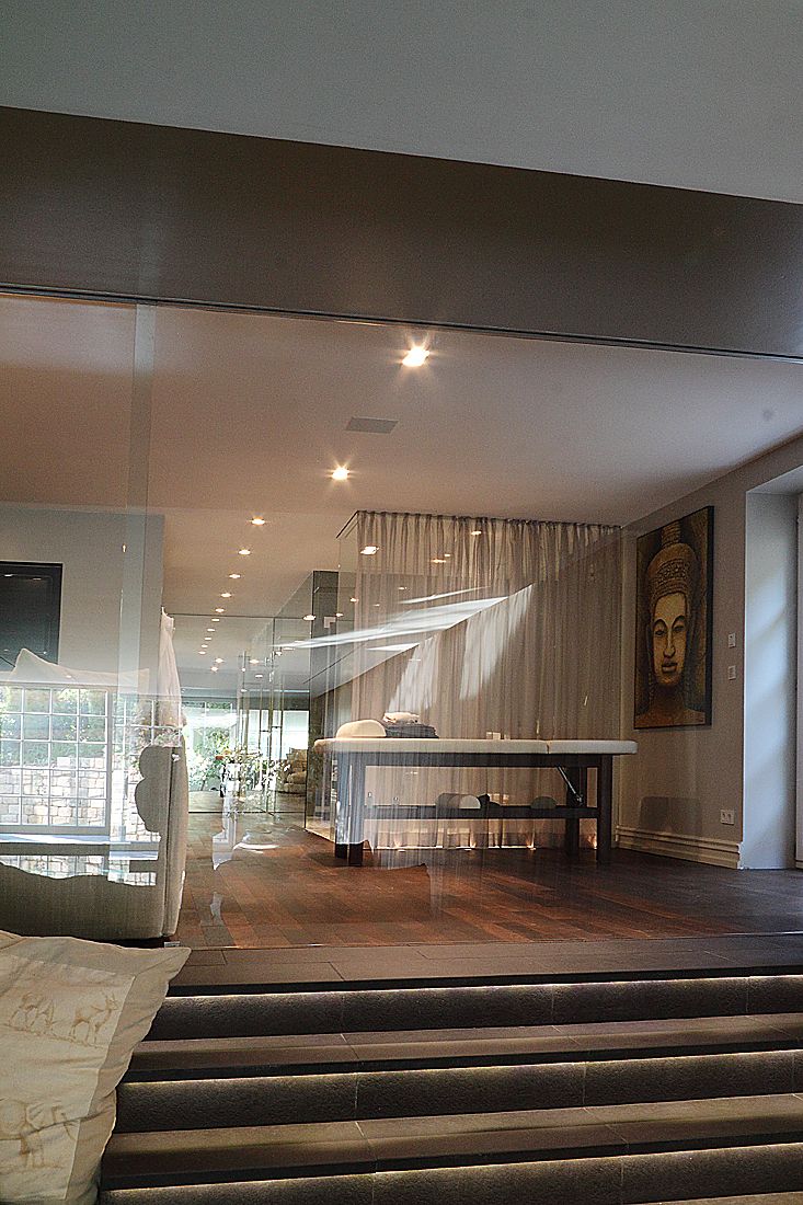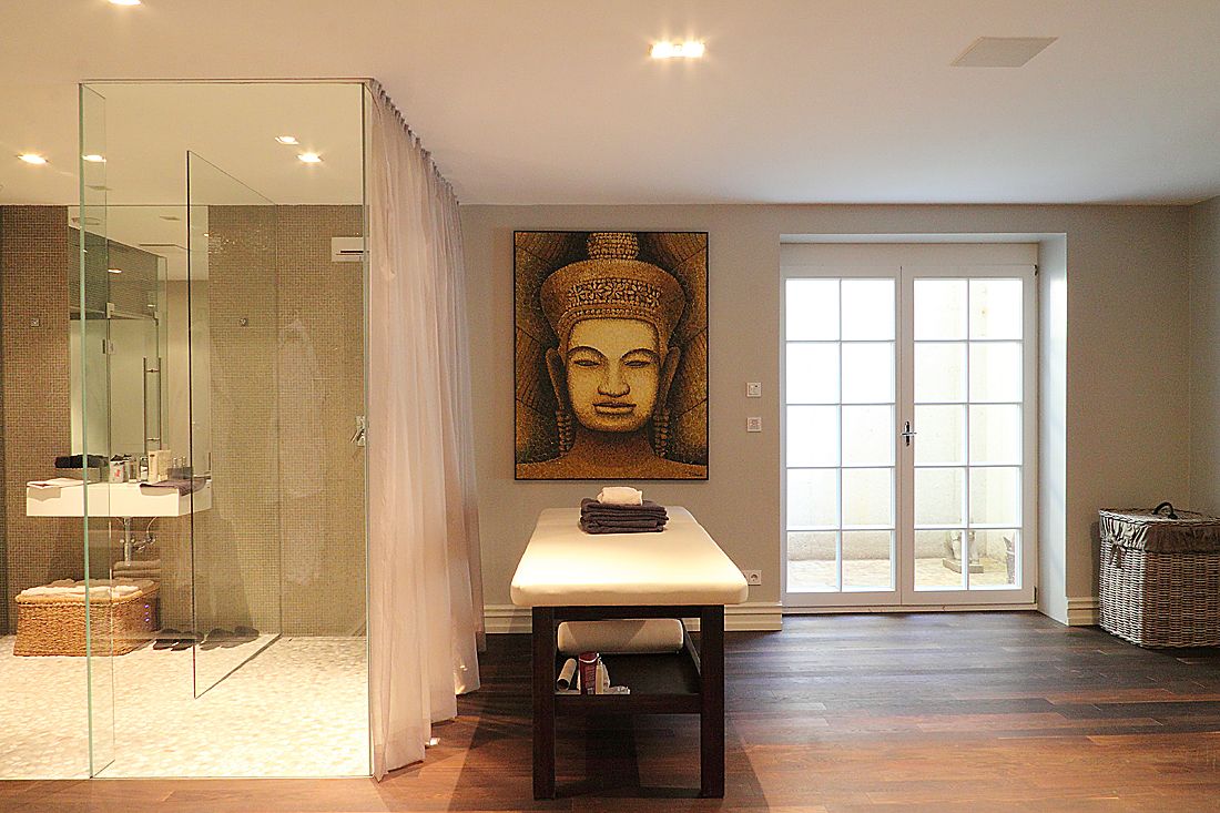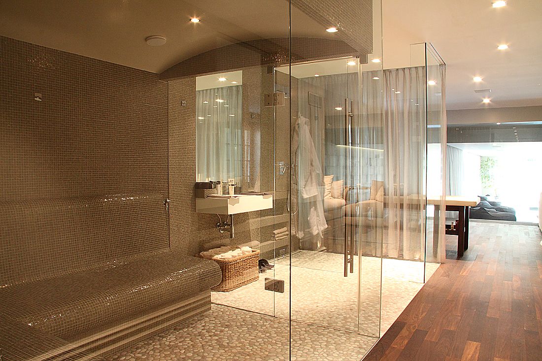 Im Verborgenen arbeitet auch die im Trockenbau integrierte Wandheizung. Über eine Wärmepumpe holt sie Energie aus der Erde und strahlt diese über Heizungselemente in den gesamten Wellnessbereich ab.