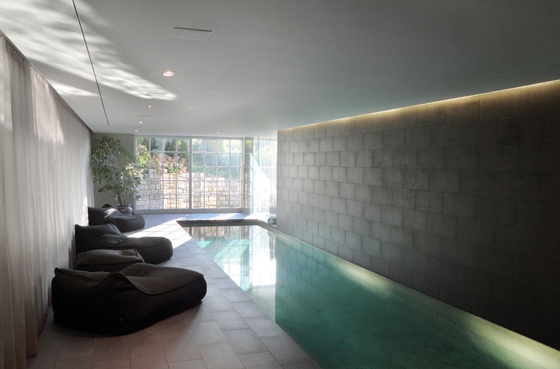 Gegensätze ziehen sich an, sagt man. Dann müssten ein Schwimmbecken und trockener Innausbau ideal harmonieren? Tun sie auch. Die abgehängte, aus Glasgranulat gefertigte Akustikdecke dämpft den Hall und dient als Refugium für die gesamte Haustechnik. Die unsichtbar dahinter verborgene Lüftungsanlage reguliert die Feuchtigkeit und Temperatur in der Schwimmhalle, sowie in Duschen und Dampfbädern.