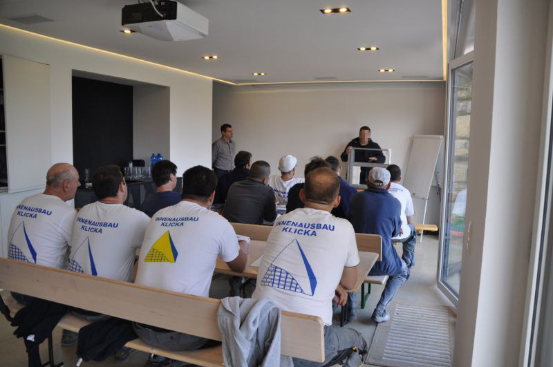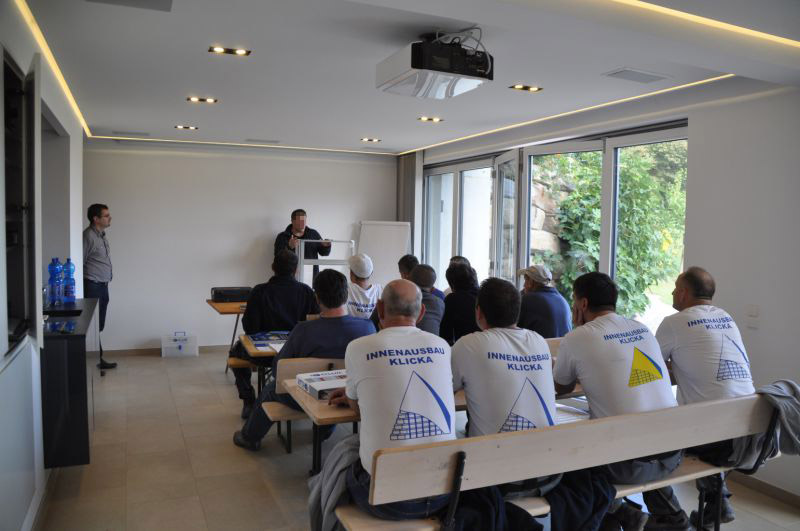 Die handwerkliche Praxis im Umgang mit neu entwickelten Materialien und Techniken holen sich unsere Mitarbeiter in mehrtägigen Intensiv-Workshops bei den Produzenten.